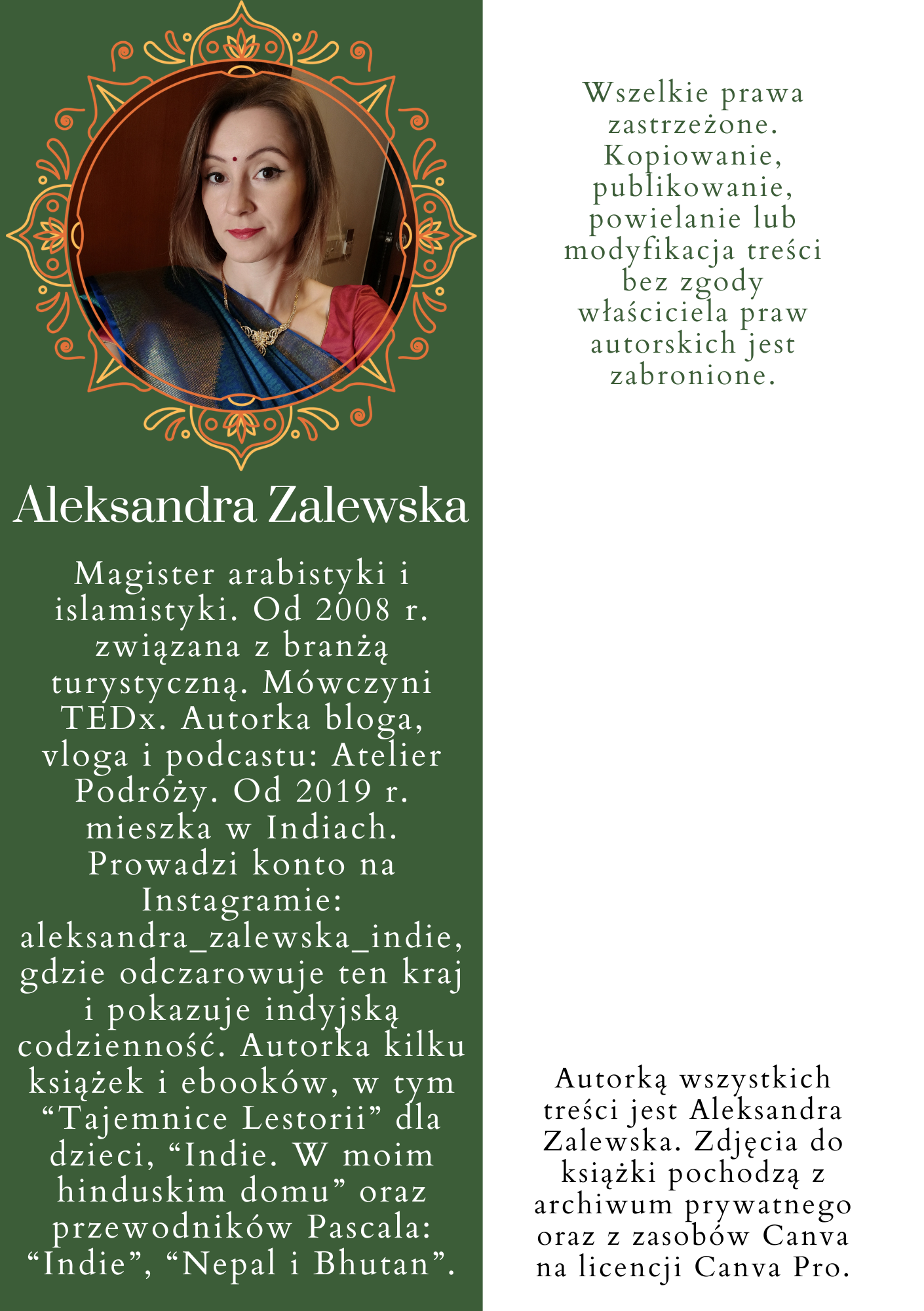 Hej, nazywam się Aleksandra Zalewska i od 2019 roku odczarowuję Indie, obalając mity i walcząc ze stereotypami i uprzedzeniami. Mój mąż jest Indusem, a w 2024 roku urodziła się nasza córeczka. Od 2008 roku jestem związana z branżą turystyczną. W tym ebooku znajdziesz zarówno moją perspektywę jako mamy, jak i pilota wycieczek; żony hindusa i kulturoznawczyni.